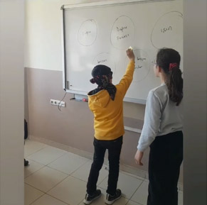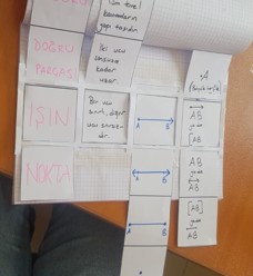 Küçük post it lere geometrik kavramlara ve doğruların birbirine göre konumuna ait bilgiler, semboller ve örnekler, tahtaya da kavramların isimlerini yazıyoruz. Sonra gönüllü öğrencilerimizden birinin gözünü bağlayıp, post it lerden birini eline veriyoruz ve sınıfın herhangi bir yerine götürüp bırakıyoruz. Bir diğer öğrencimiz 5 adım ileri, 2 adım sağa gibi komutlarla önce arkadaşını tahtanın önüne getiriyor. Sonra biraz sola, biraz yukarı gibi komutlarla post iti ait olduğu kavramın çemberinin içine yapıştırmasını sağlıyor. Bu arada gerekli güvenlik önlemlerini almak sizden, valla biri bi yere çarparsa sorumluluk kabul etmem şimdiden söyleyeyim.